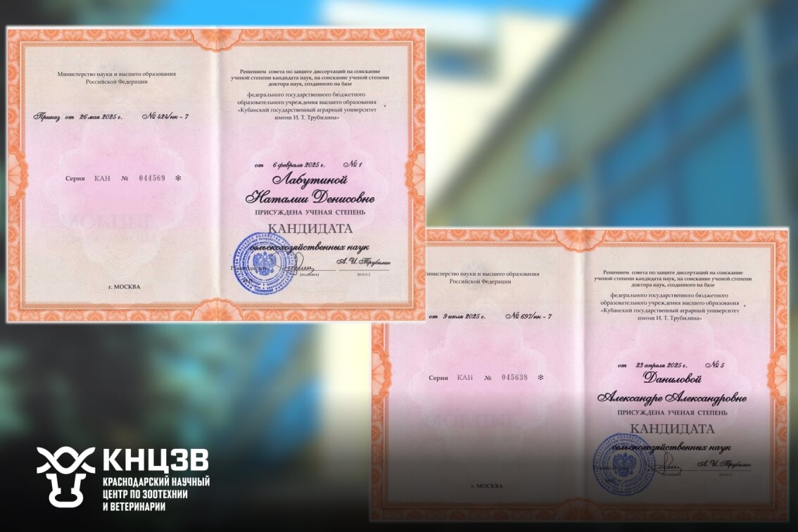 20 октября 2025 года на заседании ученого совета ФГБОУ ВО «Кубанский государственный аграрный университет им. И.Т. Трубилина» проректором университета, кандидатом экономических наук, доцентом, Петухом Алексеем Владимировичем вручены дипломы кандидата сельскохозяйственных наук: Даниловой Александре Александровне и Лабутиной Наталии Денисовне, научным сотрудникам отдела кормления и физиологии сельскохозяйственных животных ФГБНУ КНЦЗВ.