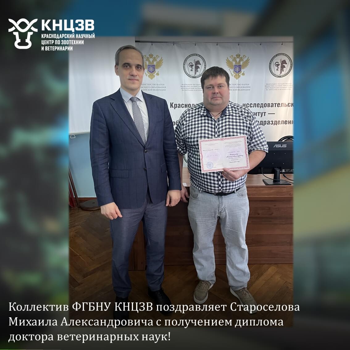 11 марта 2026 года в Краснодарском научно-исследовательском ветеринарном институте – обособленном структурном подразделении федерального государственного бюджетного научного учреждения «Краснодарский научный центр по зоотехнии и ветеринарии» состоялось вручение диплома доктора ветеринарных наук заведующему отделом терапии и акушерства Староселову Михаилу Александровичу. Диплом вручал директор ФГБНУ КНЦЗВ, доктор сельскохозяйственных наук, профессор РАН Осепчук Денис Васильевич.